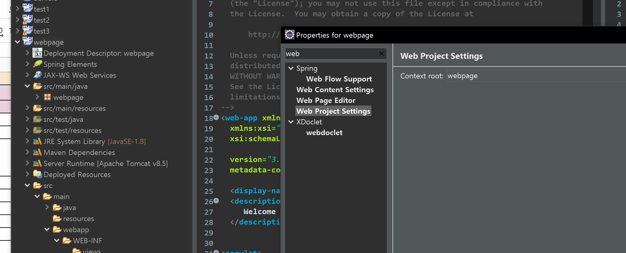 프로젝트 => Properties => Properties for webpage 에서
