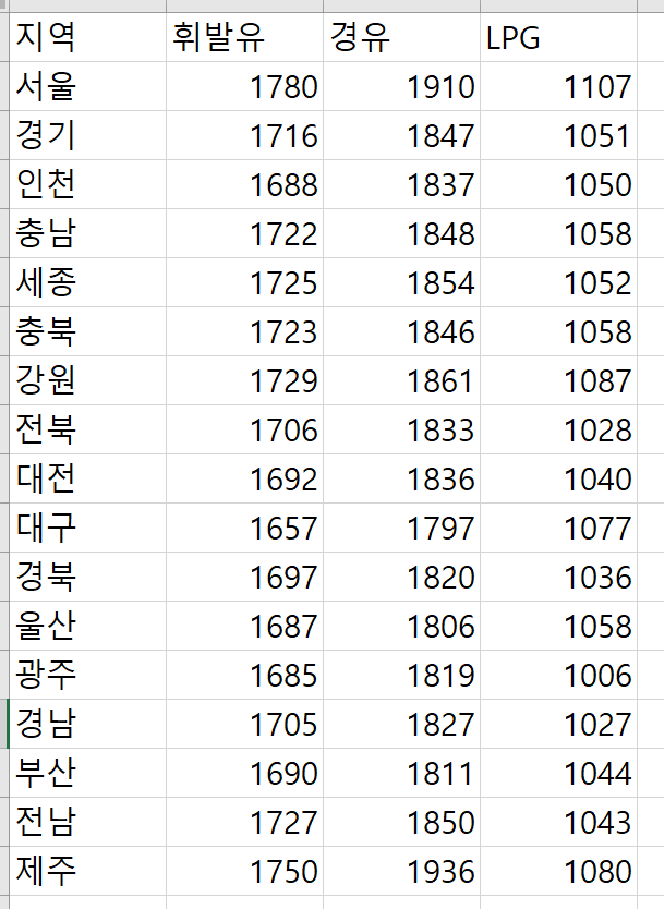 휘발유가 1700 이하이고, 경유가 1800 이하인 데이터