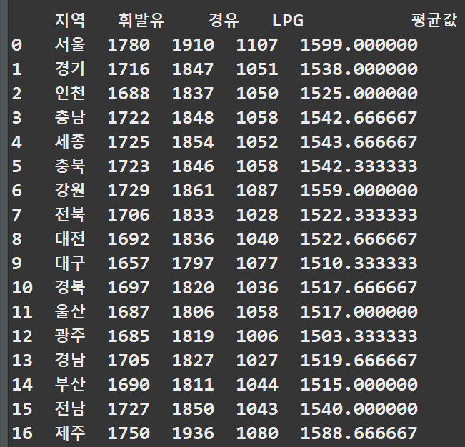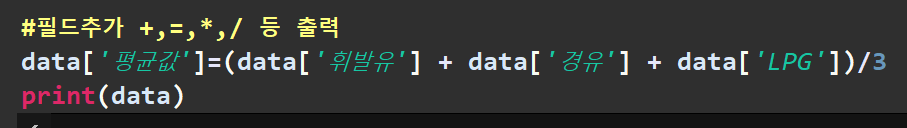 data['평균값']=(data['휘발유'] + data['경유'] + data['LPG'])/3