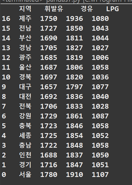 print(data.sort_values(["휘발유","경유"],ascending=True))