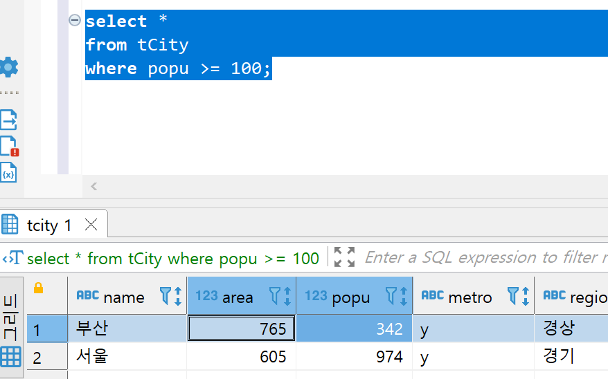 => tCity테이블에서 popu가 100이상이고 area가 700이상인 데이터 조회