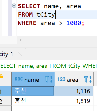=>tCity테이블에서 area가 100보다 큰 데이터의 name과 area조회
