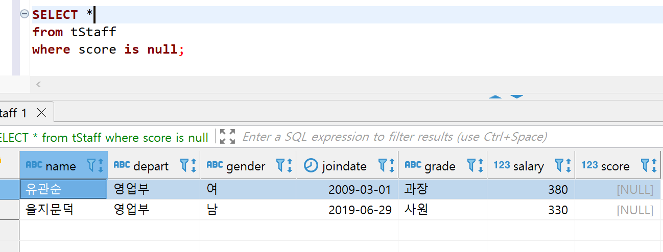 =>tStaff테이블에서 score가 NULL 인 데이터 조회