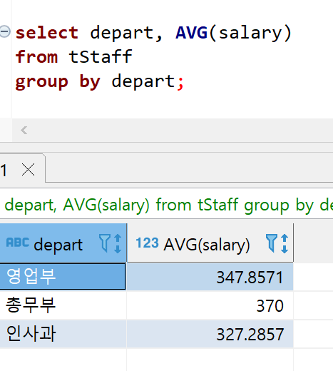 ->tStaff테이블에서 depart별로 그룹화 한 후 salary의 평균 조회