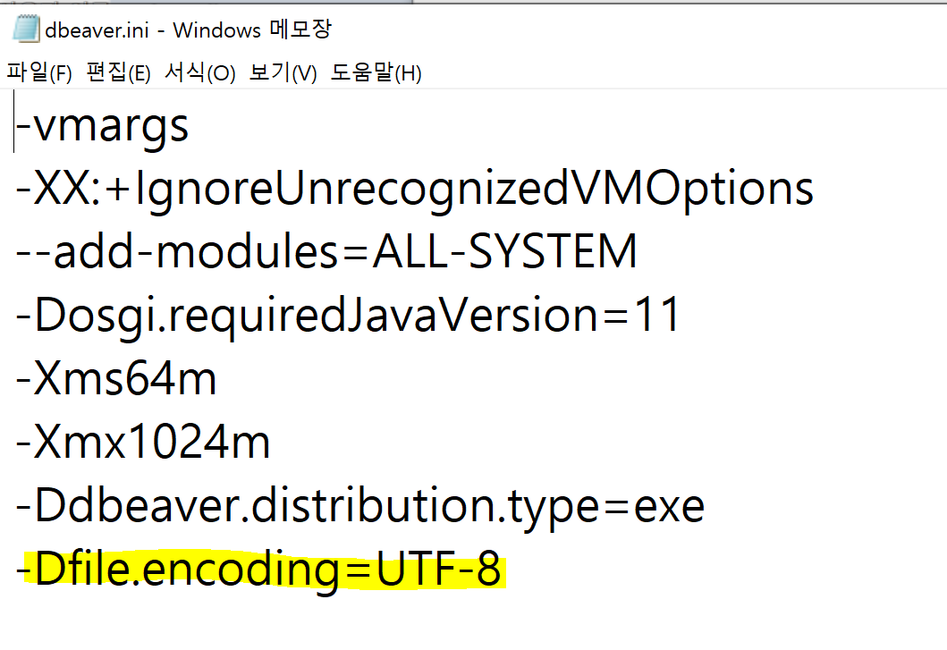 dbeaver.ini 파일을 메모장으로 열어 준 뒤