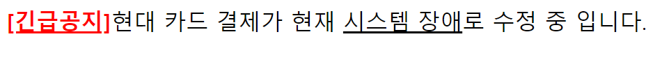 <font color="red"><u><b>[긴급공지]</b></u></font>현대 카드 결제가 현재 <u>시스템 장애</u>로 수정 중 입니다.