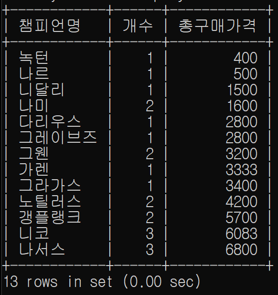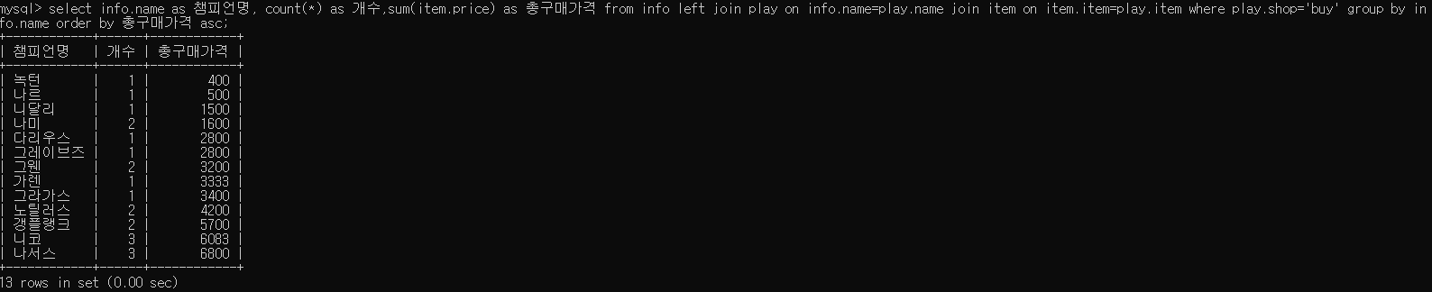 select info.name as 챔피언명, count(*) as 개수,sum(item.price) as 총구매가격 from info left join play on info.name=play.name join item on item.item=play.item where play.shop='buy' group by info.name order by 총구매가격 asc;