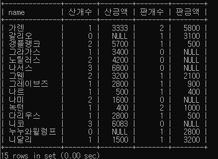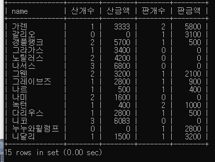 select play.name,count(case when play.shop='buy' then 1 end) as 산개수,ifnull(sum(case when play.shop ='buy' then item.price end),0) as 산금액,count(case when play.shop='sell'then 1 end)as 판개수,Ifnull(sum(case when play.shop='sell'then item.price end),0)as 판금액 from play join item on play.item=item.item group by play.name;