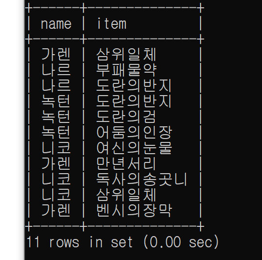 select name,item from play where name in ('가렌','나르','녹턴','니코');
