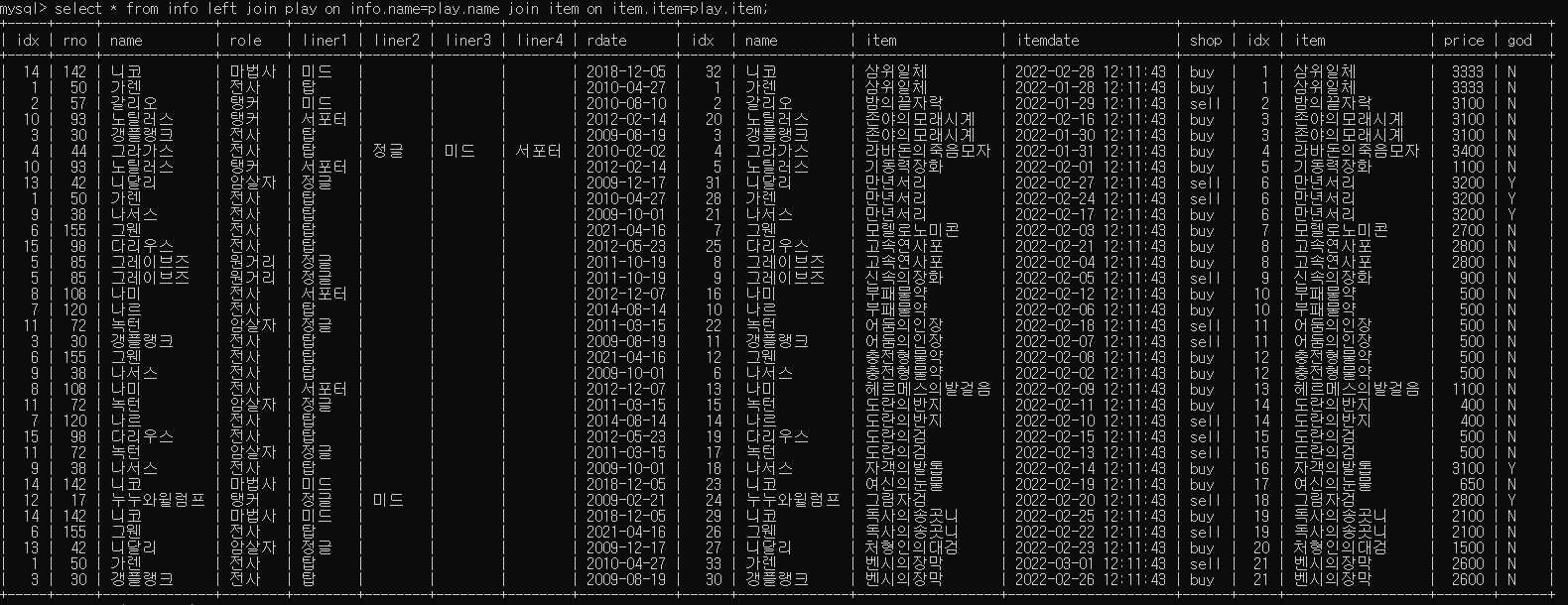 table확인해보니까 info.name 과 play.name 과 같고 item.item하고 play item이 같네요.
