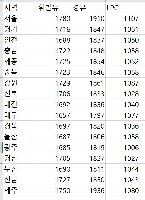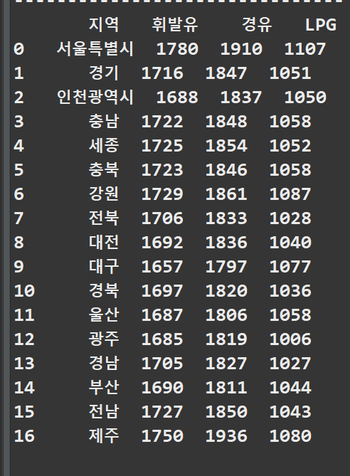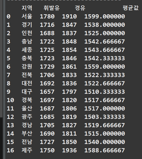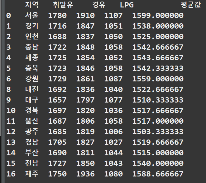 data['평균값']=(data['휘발유'] + data['경유'] + data['LPG'])/3