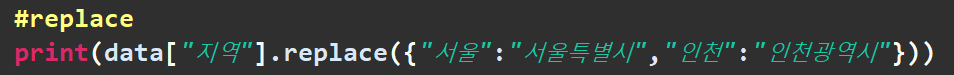 print(data["지역"].replace({"서울":"서울특별시","인천":"인천광역시"}))