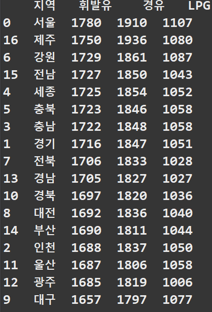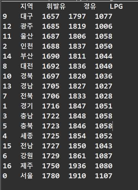 print(data.sort_values(["휘발유","경유"],ascending=True))
