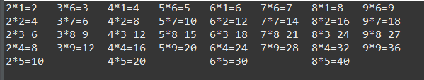 System.out.print(j + "*" + i + "=" + j * i + "\t");