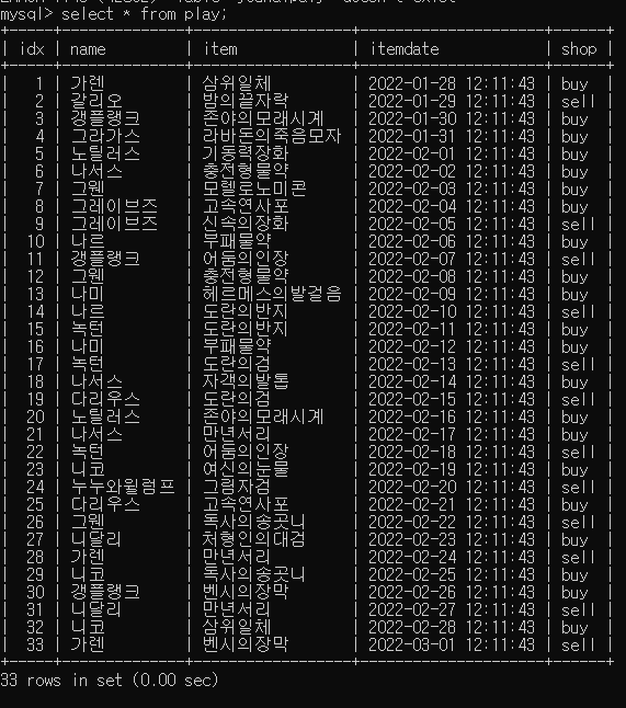 table확인해보니까 info.name 과 play.name 과 같고 item.item하고 play item이 같네요.